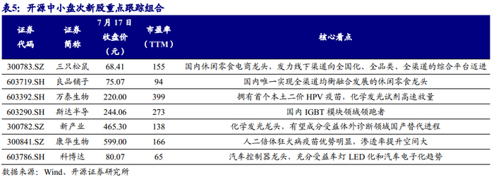 三只松鼠(国内休闲零食电商龙头,发力线下渠道向全国化、全品类、全渠道的综合平台迈进)、良品铺子(国内唯一实现全渠道均衡融合发展的休闲零食龙头)、万泰生物(拥有首个本土二价HPV疫苗,化学发光试剂高速放量)、斯达半导(国内IGBT模块领域领跑者)、新产业(化学发光龙头,有望充分受益体外诊断领域国产替代)、康华生物(人二倍体狂犬病疫苗优势明显,渗透率提升空间大)、科博达(汽车控制器龙头,充分受益车灯LED化和汽车电子化趋势)。