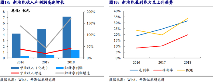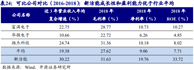 公司2016、2017、2018年营业收入分别为4.2、5.0、7.2亿元,CAGR为30.2%,对应归母净利润分别为0.4、0.5、1.4亿元,CAGR为98.1%。公司2018年营收增长的主要原因系沟槽型功率MOSFET、屏蔽栅功率MOSFET以及超结功率MOSFET业绩增长。2016至2018年,公司毛利率分别为18.9%、24.7%、31.6%,净利率分别为8.5%、10.3%、19.8%,ROE分别为23.7%、19.7%、33.7%。