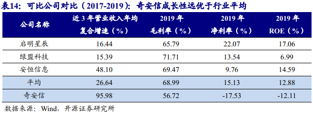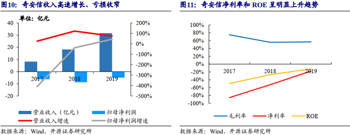 公司2017、2018、2019年营业收入分别为8.2、18.2、31.5亿元,CAGR为96.0%,对应归母净利润分别为-6.3、-8.7、-4.9亿元。公司尚未实现盈利主要原因系业务仍处于拓展期,需要投入更多的资源和费用进行创新研发和市场拓展,导致期间费用率远超同行业均值。2019年公司销售费用及研发费用分别占营业收入的35.5%和33.2%。但随着收入的快速增长,规模效应逐步显现,公司期间费用率逐年下降,盈利能力呈明显上升的趋势。2017至2019年,公司毛利率分别为74.9%、55.7%、56.7%,净利率分别为-85.5%、-52.4%、-17.5%,ROE分别为-49.5%、-27.0%、-12.1%。