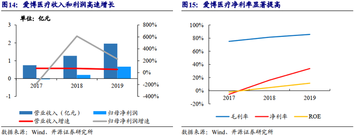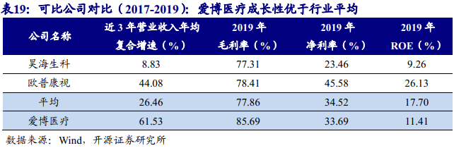 公司2017、2018、2019年营业收入分别为0.7、1.3、2.0亿元,CAGR为61.5%,对应归母净利润分别为0.0、0.2、0.7亿元。2019年公司营收增长的主要原因系人工晶状体中端产品A1-UV/A2-UV/ALD和高端产品AQBH/AQBHL销售额大涨。2017至2019年,公司毛利率分别为75.1%、81.4%、85.7%,净利率分别为-5.5%、16.0%、33.7%,ROE分别为-2.1%、4.7%、11.4%。