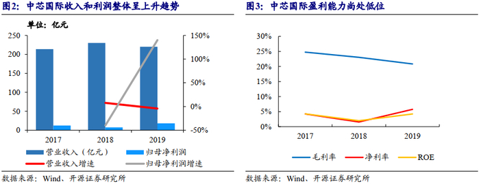 公司2017、2018、2019年营业收入分别为213.9、230.2、220.2亿元,CAGR为1.5%,对应归母净利润分别为12.4、7.5、17.9亿元,CAGR为20.0%。公司于2019年7月将意大利子公司LFoundry对外转让,转让后至2019年末公司合并收入中不再包含LFoundry收入,扣除LFoundry影响后的各期收入分别为198.5亿元、215.5亿元及213.3亿元,整体呈上升趋势。2017至2019年,公司毛利率分别为24.8%、23.0%、20.8%,净利率分别为4.2%、1.6%、5.8%,ROE分别为4.3%、2.0%、4.3%。