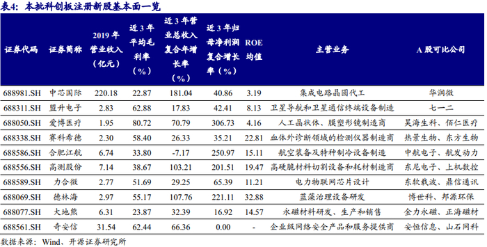 证监会本批核发新股13家(上批10家),科创板注册10家(上批8家),核发和注册速度均加快。传统A股:新洁能(半导体芯片和功率器件制造)、宝明科技(LED背光源和触摸屏制造商)、晨光新材(功能性硅烷基础原料、中间体及成品制造商)、华丰动力(柴油发动机、核心零部件制造商)、华达新材(多功能彩色涂层板、热镀锌铝板制造商)、甘源食品(休闲食品制造商)、百亚股份(一次性卫生用品制造商)、科拓生物(食品添加剂、食用益生菌生产)、法狮龙(集成吊顶、集成墙面生产)、国联证券(综合型券商)、昆山沪光(汽车线束制造商)、协创数据(物联网智能终端和数据存储设备研发)、起帆电缆(电线电缆生产);科创板:中芯国际(集成电路晶圆代工)、奇安信(企业级网络安全产品和服务提供商)、盟升电子(卫星导航和卫星通信终端设备制造商)、爱博医疗(人工晶状体、膜塑形镜制造商)、赛科希德(血栓等体外诊断领域的检测仪器制造商)、合肥江航(航空装备及特种制冷设备制造)、高测股份(高硬脆材料切割设备和切割耗材制造商)、力合微(电力物联网芯片设计)、德林海(蓝藻治理设备研发)、大地熊(永磁材料制造商)。