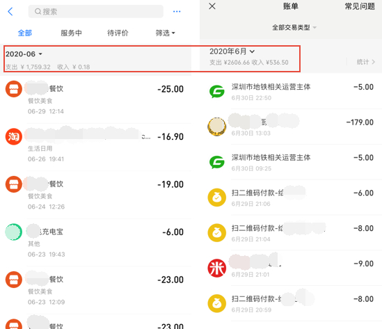 小杨向记者展示了他的支付宝、微信支付消费账单数据,以过去的6月份为例,小杨共计消费了4365.98元,其中发生在夜间18点到凌晨6点的消费金额为3442.52元,夜间消费占比接近八成。
