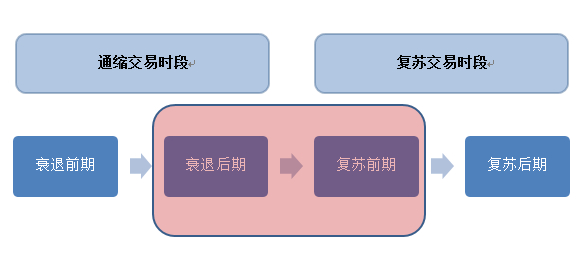 第二,在本篇中我们继续对这一框架做出延展,把经济进一步细分为四个阶段。显然“通缩交易”一般对应经济的衰退前期、衰退后期;“复苏交易”一般对应经济的复苏前期、复苏后期(图)。