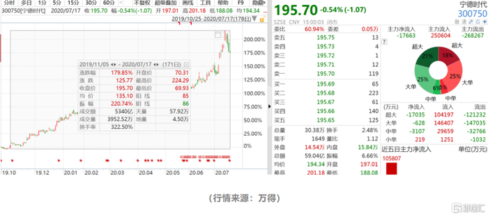 正是这样的表现,宁德时代股价从去年低位至今,累计涨幅近180%,市值4319亿元,成为创业板一哥!