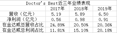 过去三年,Doctor's Best的营收逐年递增,保持约12%的复合增速。虽然由于金达威的不断并购,Doctor's Best所创造的营收在总营收中的占比不断下降,但其在公司中所占的利润却持续攀升。