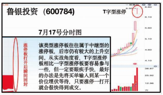 老盘口回道:“鲁银投资(600784)上周五的盘口就是典型的T字型涨停板。”