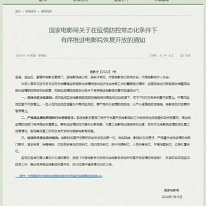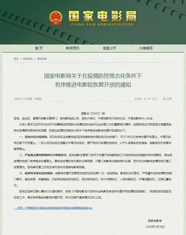 据国家电影局7月16日所发布通知,低风险地区电影院在各项防控措施有效落实到位的前提下,可于7月20日有序恢复开放营业。