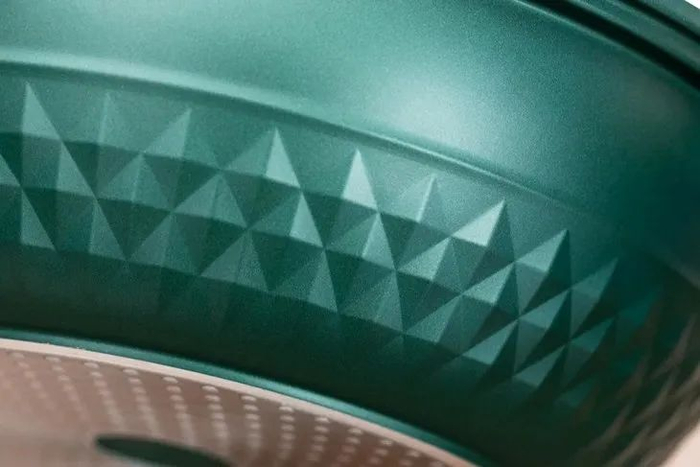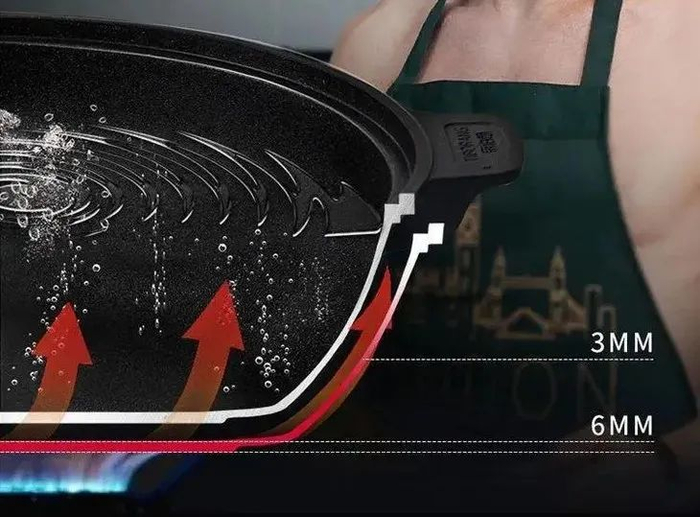 钻石纹在明火下通过折射的优势增加导向性受热,结合五层复底3D导热技术,帮助锅身导热存热,同时减少食材对油脂的吸收。