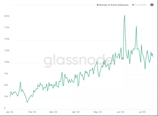 或许是受到COVID-19以及全球经济不稳定性增强的影响,市场对于USDT的避险需求仍在不断加强。据Glassnode的数据显示,步入六月,也就是全球第二波疫情爆发开始,USDT活跃地址数量增速减缓。但其总地址数量依旧呈指数级增长趋势,数值于Q2上涨81%,与Q1相比增速加快51个百分点;说明链上的价值存储趋势正逐步提高,用户持币观望的倾向更为强烈。