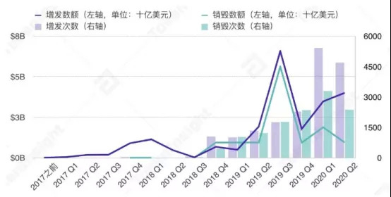 理论上,USDT的负溢价还会促使Tether回收相关代币,进而销毁。但从该稳定币种过去几年的增发以及销毁数据来看,今年以来两者之间的关系似乎发生了些许变化。不同于以往增发数额与销毁数额相差较少的情况,自2020年Q1开始两者之间的差距逐步拉大,并于Q2表现出相反的增长趋势。所以说,在场内市场表现低迷的大背景下,用户对于USDT的需求量仍旧旺盛。