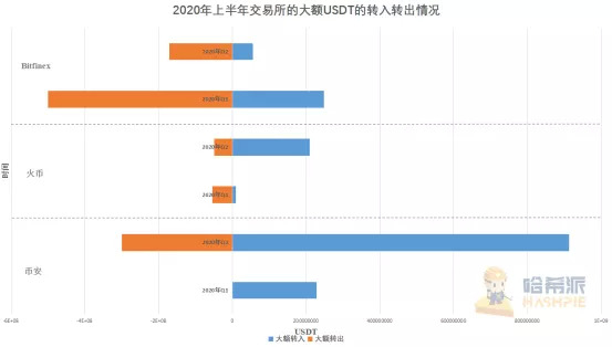 2020年上半年交易所的大额USDT的转入转出情况(数据源自:Whalealert)