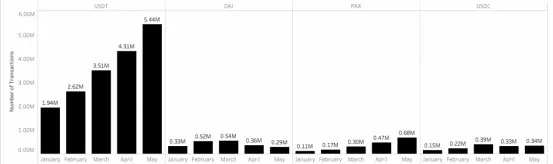 虽然链上交易额和交易量都有显著增长,但各个稳定币网络的交易频率也在同步上涨。所以稳定币项目的平均交易规模并没有得到提升,反而有所下降。以占据市场交易额逾70%的USDT为例,该稳定币种的平均交易规模从一月份的9139美元减少至六月份的4806美元,下滑近48个百分点。这种下跌趋势侧面表明了,近月来稳定币交易量以及市场需求量的暴涨很大部分来源于小额零售交易。