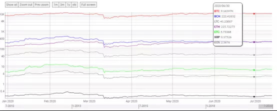 2020年以来比特币、以太坊、莱特币、比特币现金等主流加密货币的价格走势(数据源自:Coin Metrics)
