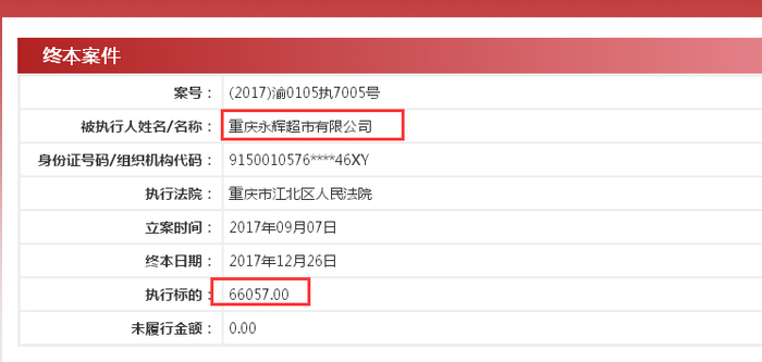 另外,2017年09月07日,重庆永辉超市有限公司被重庆市江北区人民法院列为被执行人,执行标的为66057.00,终本日期为2017年12月26日。