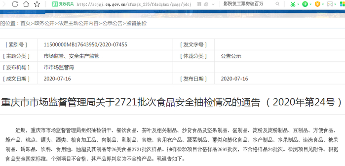 7月16日,重庆市市场监督管理局发布《重庆市市场监督管理局关于2721批次食品安全抽检情况的通告 (2020年第24号)》,显示,近期,重庆市市场监督管理局组织抽检饼干、餐饮食品、茶叶及相关制品、炒货食品及坚果制品、蛋制品、淀粉及淀粉制品、豆制品、方便食品、蜂产品、糕点、罐头、酒类、粮食加工品、肉制品、乳制品、食糖、食用农产品、蔬菜制品、薯类和膨化食品、水产制品、水果制品、速冻食品、糖果制品、调味品、饮料、食用油、油脂及其制品等26类食品2721批次样品。抽样检验项目合格样品2697批次,不合格样品24批次。