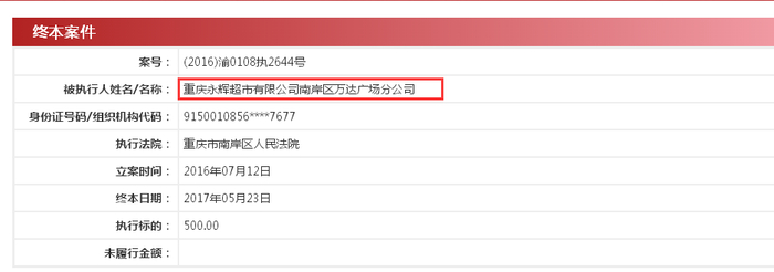 此外,重庆永辉超市有限公司南岸区万达广场分公司于2016年07月12日被重庆市南岸区人民法院立案,列为被执行人,执行标的为500.00。终本日期为2017年05月23日。