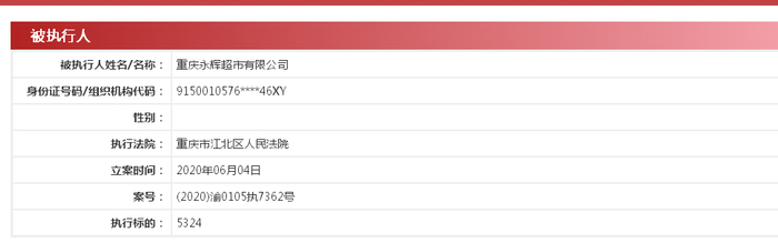 据中国执行信息公开网,重庆永辉超市有限公司于2020年06月04日被重庆市江北区人民法院列为被执行人,执行标的为5324。