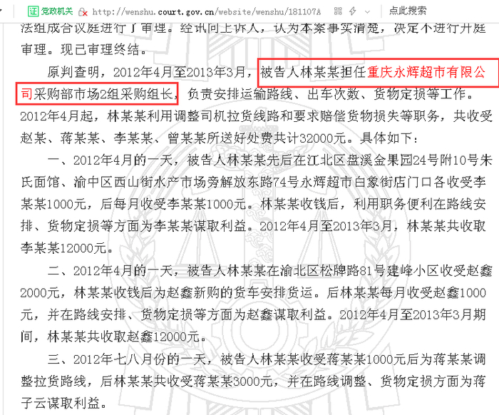 除了食品安全问题,刻在重庆永辉历史上的“黑印记”还有,其旗下采购员工曾收受贿赂。