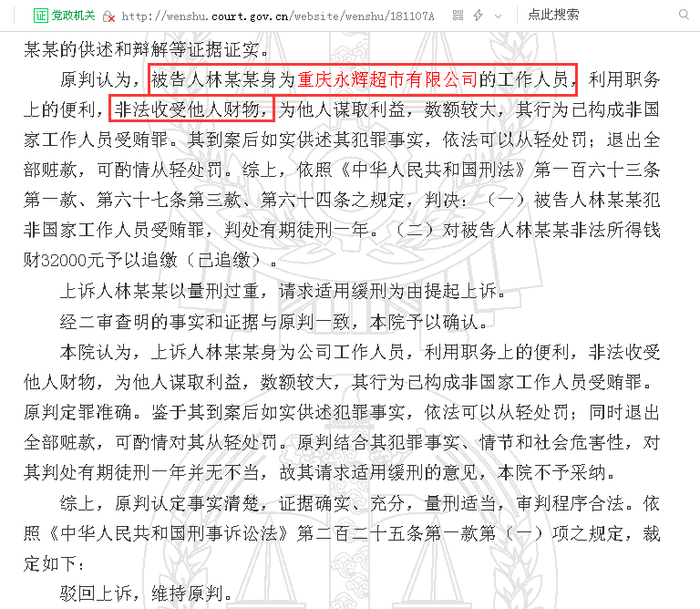 上述裁定书显示,原判查明,2012年4月至2013年3月,被告人林某某担任重庆永辉超市有限公司采购部市场2组采购组长,负责安排运输路线、出车次数、货物定损等工作。2012年4月起,林某某利用调整司机拉货线路和要求赔偿货物损失等职务,共收受赵某、蒋某某、李某某、曾某某所送好处费共计32000元。
