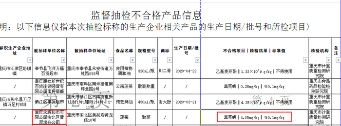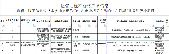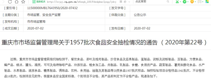 7月2日,重庆市市场监督管理局发布《重庆市市场监督管理局关于1957批次食品安全抽检情况的通告 (2020年第22号)》,显示,本次抽检28类食品1957批次样品,其中抽样检验项目合格样品1941批次,不合格样品16批次。