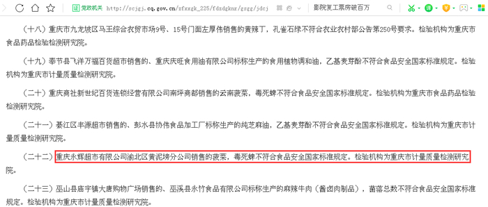 不合格食品多次被检出的永辉超市,近期,其旗下超市重庆永辉超市再次被检出问题食品,并且同一名称生鲜食品在相隔两个星期前后均被披露抽检不合格。