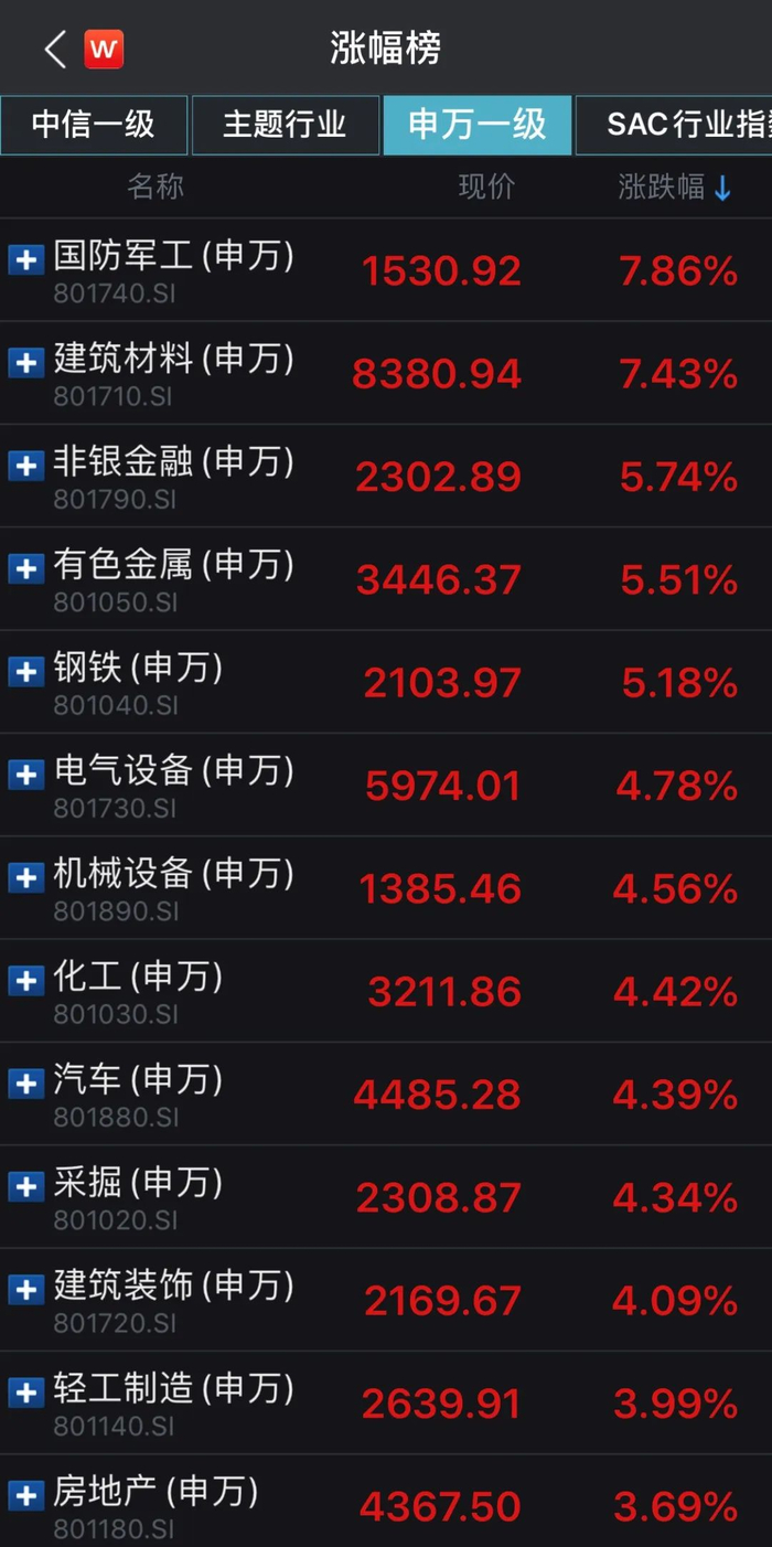 上证综指1559只成份股中,有1431只股票上涨,涨幅超过5%的有353只,其中85只股票涨幅在9%以上。对上证综指贡献前20只股票中,中国人寿、中国平安、中信证券等金融股提供了支撑力量,海螺水泥、三一重工、中国重工、万华化学等个股也起到提振作用。