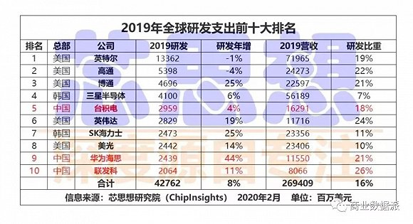 既然是强技术驱动的商业,那么必然在研发投入上少不了。下图是2019年全球芯片企业对于研发投入上的量级和占比。