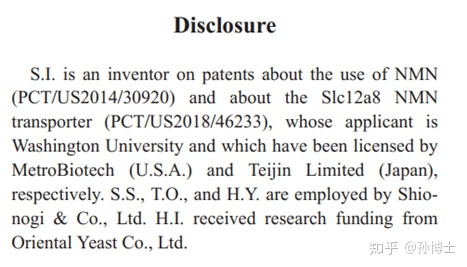 在上述提及的研究成果中,日本研究学者Shin-ichiro Imai教授对NMN的研究结果发表在了2020年的《Endocrine Journal》上,该教授曾有一个名为Slc12a8的NMN转移酶的专利申请,而这个专利被美国的MetroBiotech公司和日本的帝人集团挂牌,通讯作者H.I。从日本的Oriental Yeast公司得到经费支持,而这个Oriental Yeast公司就有NMN的产品,这篇研究中使用的NMN就是这家公司提供的。