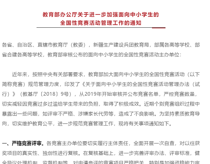 7月20日,教育部印发《关于进一步加强面向中小学生的全国性竞赛活动管理工作的通知》,对于前一段时间沸沸扬扬的中小学竞赛乱象做出回应。