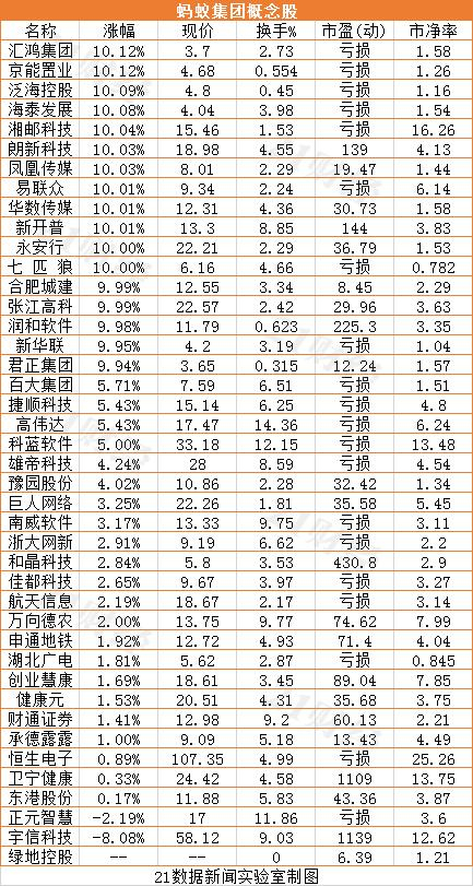 7月21日,受蚂蚁集团正式启动IPO消息影响,蚂蚁金服概念股上演涨停潮,截至收盘,17只蚂蚁金服相关概念股涨停,其中有6只获北上资金提前扫货。