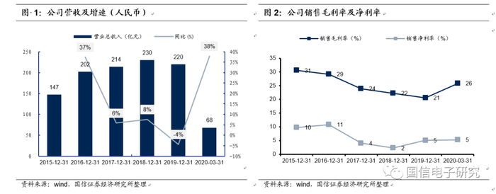 供给驱动型国产半导体中军,2020年开始高增长。经过2017年-2019年三年的平稳期之后,公司即将迎来高速成长期。20年Q1收入为64.01亿元,同比增长38.42%,扣非后净利润为1.42亿元,2019年同期为-3.29亿元。晶圆出货量折合成8英寸为140.67万片,同比增长29%;销售毛利率回升至25.81%。预计随着14nm量产进程的加速,受益国产替代的市场扩容机会以及国内下游企业转单,今年营收有望实现高速增长。公司指引2020年Q2收入环比增长3%-5%,收入区间为65.93亿元~67.21亿元,同比增长21%~23%,持续高增长。