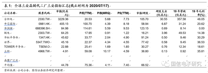 一、截止2020年7月17日,当前全球晶圆厂主要估值指标: