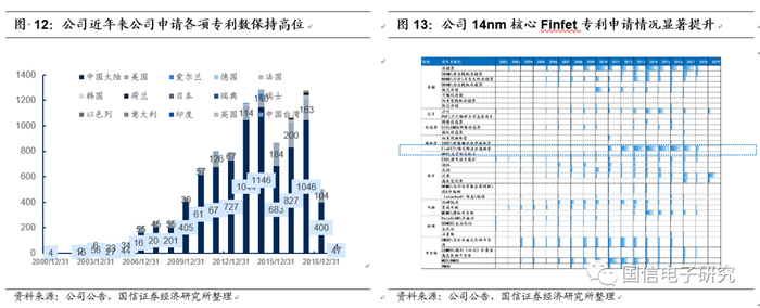 近年来公司专利申请数量总体上保持高位,公司加大海外专利的申请。在14nm关键工艺Finfet技术上,公司从2012年已开始布局,近年来申请专利数量显著提升。