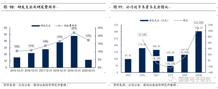中芯国际作为中国内地芯片产业的旗手,肩负半导体产业链发展重担。公司2019年研发费用为47亿元,约占营收22%,预计2020年资本支出将创纪录超300亿人民币。2019年研发人员增长至2530人,14nm约100人,N+1约300人。公司相继实现了28nm HKC+工艺及14nm FinFET工艺的研发和量产,第二代FinFET技术进展顺利,且已进入客户导入阶段。公司N+1工艺相较14nm性能提升20%,功耗降低57%,逻辑面积缩小63%,SoC面积缩小55%,接近台积电7nm工艺。公司未来将成为国内唯一承接先进制程工艺需求的代工厂。