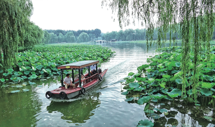 游客在北京圆明园遗址公园乘船赏荷(李欣 / 摄 )