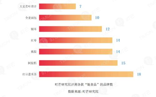 其中町芒研究院针对女性消费者相对比较喜欢的7款“她食品”(这7款“她食品”涵盖滋补营养品、减脂、体重控制和养生茶)进行了深度解析,这7款“她食品”分别是银耳、阿胶糕、红枣、青汁、全麦面包、桃胶和红豆薏米茶,其中测评的红豆薏米茶涉及品牌最多,高达18个品牌,都是市场上比较火的品牌;由于市场上大麦青汁的品牌较少,町芒研究院又多方比对,所以最终评测品牌仅涉及7个品牌,但却都是市场上综合评价较好的品牌。