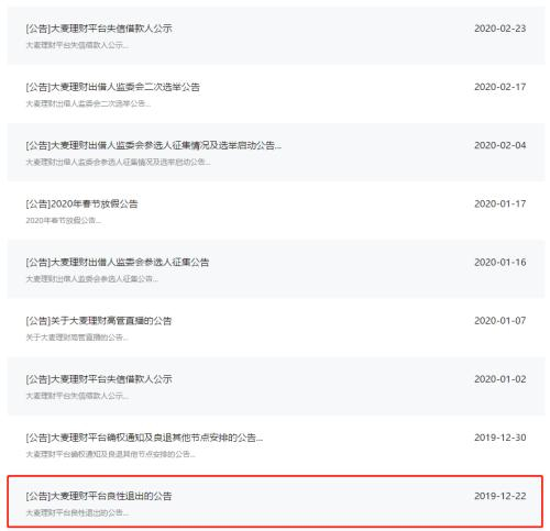 2019年6月,大麦理财出现逾期。其官网上最后一期运营月报发布于2019年11月18日,同年12月22日,大麦理财发布良性退出公告。