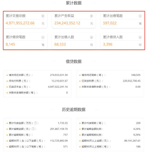 大麦理财平台运营数据显示,截至7月22日,大麦理财已运营5年285天。截至目前,平台累计交易额49.7亿元,累计出借人数和累计借贷人数分别为68333人和3396人,借贷待还余额2.75亿元,待兑付利息1331万元,逾期90天(含)以下金额(元)为1.13亿元,逾期90天以上金额8914万元。
