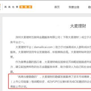 大麦理财官网显示,该公司成立于2014年,是中国较早成立的网络借贷信息中介服务平台之一。该公司已先后获得具有国资背景的公司和上市公司背景的公司等战略投资,成为P2P行业第6家完成C轮融资的企业。2018年10月,大麦理财确定D轮融资并启动美股上市计划。