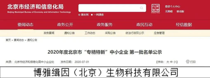 北京市首批“专精特新”中小企业认定由北京市经济和信息化局组织开展,旨在促进中小企业转型升级,提升中小企业综合竞争力,培育一批在细分行业内技术实力强、产品质量好、服务水平优、市场份额高、品牌影响大、发展前景广的中小企业。此次入选,体现了政府主管部门对于博雅辑因集团的技术实力、转化能力和发展方向的认可。