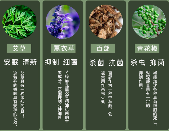 除螨包中的百部、无患子,是螨虫的“天然克星”,其抗菌活性和抗病毒活性,使螨虫代谢发生紊乱,