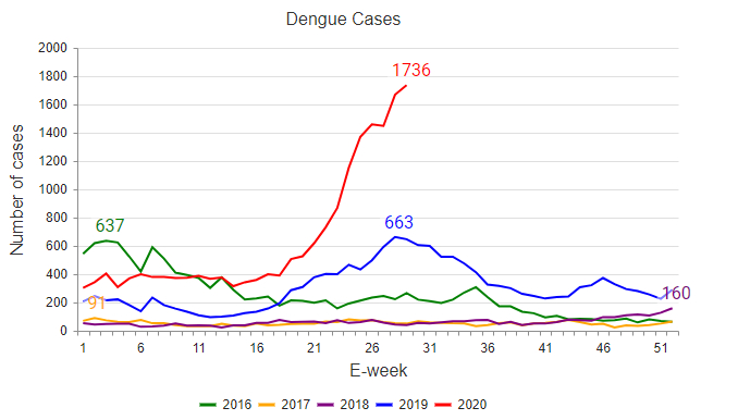 该局指出,4月及5月实施封锁措施期间,蚊虫滋生的数量翻了5倍,连建地工地的蚊虫都升至平常的两倍。该局已经呼吁民众注意卫生并使用驱蚊剂来保护自己,介于高达84%的蚊虫滋生地都是住家而非公共区域。自2020年7月15日起,为帮助更好地保障公众健康,政府加大了对滋生蚊子的家庭、建筑工地和镇议会的处罚力度。