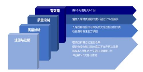 首先,结合实际情况,将仓库仓单有效期由8个月缩短为6个月,从原来的5月第15个交易日注销修订为3月第15个交易日注销,增加入库时质量容许度不超过15%的要求,降低仓库风险;其次,规定仓库仓单注销出库后不允许再次注册;并取消以折算方式注册仓单,规范了注册仓单方式,对空头更加有利;最后,明确要求复检费用由过错方承担并在结果出具日起2个工作日内通过交割服务机构支付,调整了交割结算方式的节点,将确认环节推后至货物质量确认完毕后,本次修订细化了对复检费用和复检结果的要求。