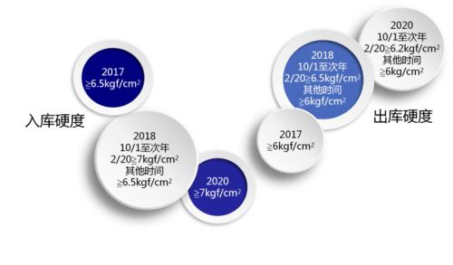 调整前入库标准要求在每年10月1日至次年2月20日(含该日)入库的苹果,硬度不得低于7kgf/ cm2,其他时间入库的苹果,硬度不得低于6.5kgf/ cm2;调整后统一入库硬度不得低于7kgf/cm2 ,修改后的标准更适应苹果作为生鲜品的本质属性,引导优质苹果到期货市场进行交割,不但利于交割仓库保存,还减少了仓单出库时的风险。同时,出库标准将每年10月1日至次年2月20日(含该日)出库的苹果硬度从不得低于6.5kgf/ cm2放宽至6.2kgf/ cm2(考虑到1月合约车(船)板最后交货日为2月20日,为保证同一批货物硬度指标要求一致,将2月20日设置为不同硬度要求的临界日期),随着出库和车板交割硬度要求的降低,交割风险也随之减少。