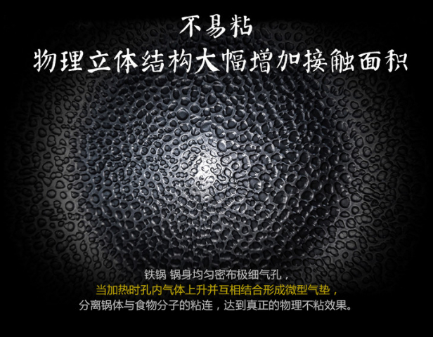 这个铁锅取材于自然纯天然优质生铁,质地坚硬耐磨,生铁高温熔炼后,配合研发制作的工艺,使锅体表面形成了独特的气室结构,锅底不易粘。