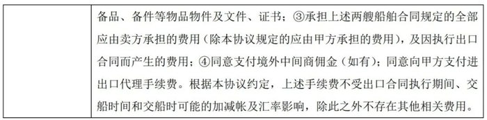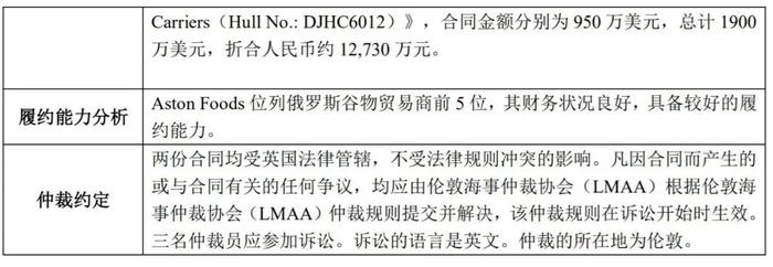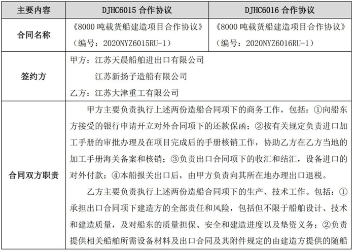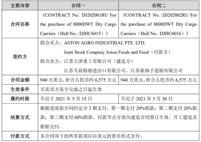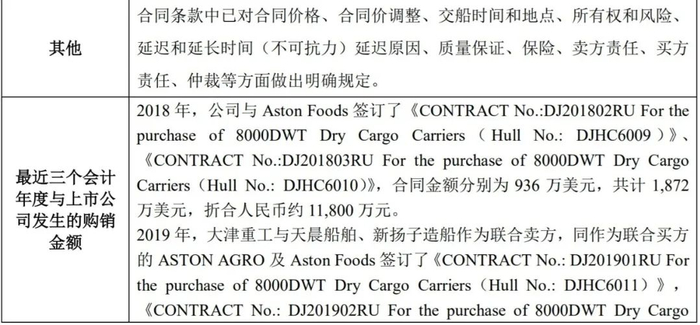 2019 年,大津重工与天晨船舶、新扬子造船作为联合卖方,同作为联合买方的 ASTONAGRO 及 Aston Foods 签订了《CONTRACT No.: DJ201901RU For the purchase of 8000DWT DryCargo Carriers(Hull No.: DJHC6011)》,《CONTRACT No.: DJ201902RU For the purchase of8000DWT Dry Cargo Carriers(Hull No.: DJHC6012)》,合同金额分别为 950 万美元,总计 1,900 万美元,折合人民币约 12,730 万元。(详见公告,编号为 2019-058)