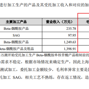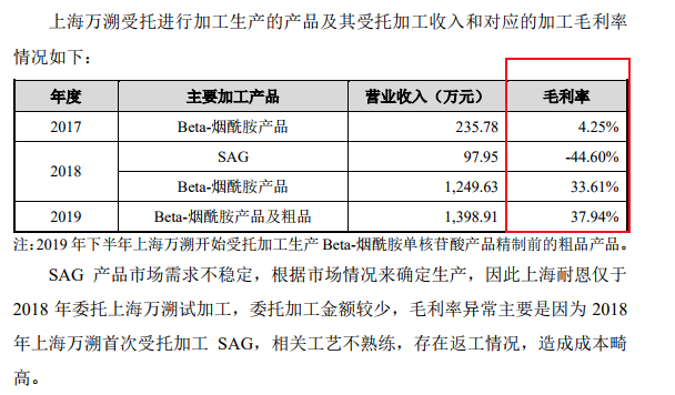 值得注意的是,这些NMN加工的毛利率在提高。数据显示,2017年、2018年,上海万溯受委托进行加工的Beta-烟酰胺产品毛利率分别为4.25%、33.61%。2019年受委托加工的Beta-烟酰胺产品及粗品毛利率为37.94%。