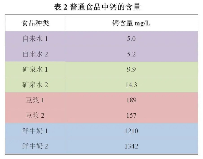 将检测样品骨头汤中的钙含量,与普通食品(豆浆、矿泉水、牛奶等)中的钙含量做对比,结果如下: