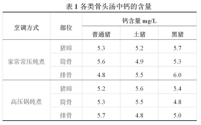 炖煮后,将骨头汤按照GB 5009.268-2016 《食品安全国家标准食品中多元素的测定》第二法电感耦合等离子体发射光谱法(ICP-OES)进行钙含量测定。比对不同类型猪骨头不同部位不同炖煮方法钙含量的差别。
